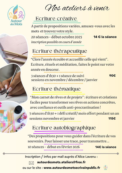 Afin d'offrir un espace d'expression au plus grand nombre, j''ai décidé d'élargir les types d'ateliers d'écriture proposés.